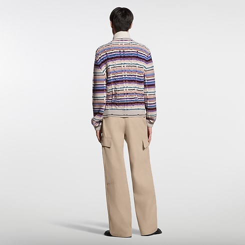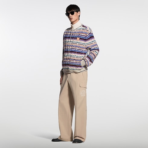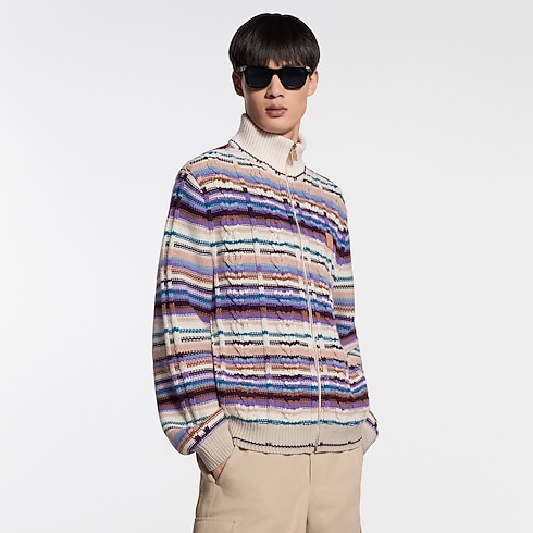 This luxurious wool-cashmere track top has a hand-crafted look, with colorful stripes incorporated into a textured cable-knit. Featuring a zipper fastening and a stand collar, it can be worn as both a cardigan or a light outer layer on warm spring days. A leather signature patch adds a smart finishing touch to the chest.