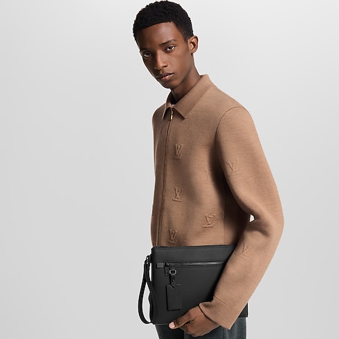 The pared-down design of the LV Aerogram Takeoff Pouch makes it a fashionable and functional accessory. Crafted in fine black calf leather, whose soft, supple feel recalls an old-fashioned aerogram, it features the “LV” initials in black metal and a customizable tag for an understated signature touch – plus user-friendly extras like a removable leather wristband.