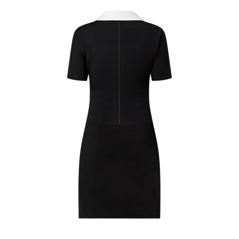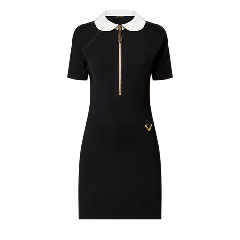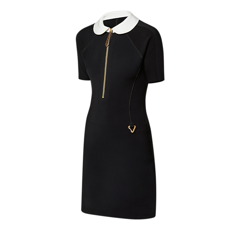 This dress is cut from sleek technical jersey that skims and smoothes the figure for a clean, sporty look, which is underscored with an exposed half-zipper fastening and a golden triangular carabiner detail on the hip. Trim short sleeves and a contrasting Peter Pan collar complete the look with a chic feminine feel.