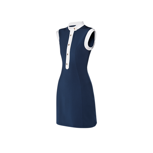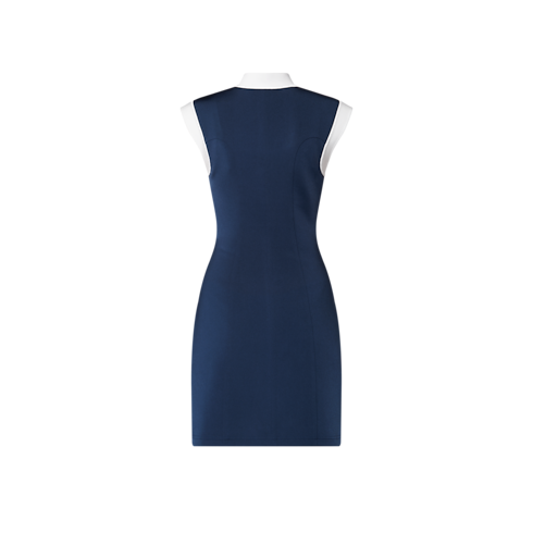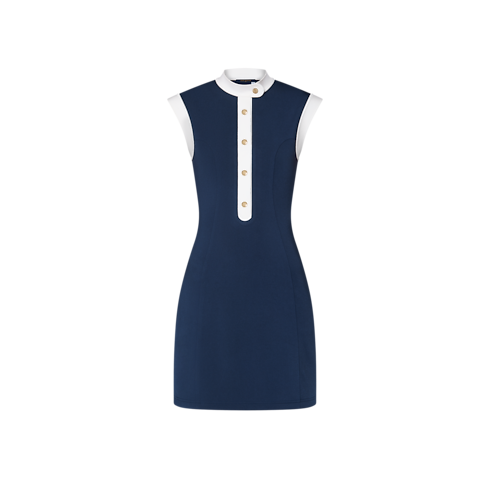 This dress is sleek and sporty in smooth, form-fitting technical jersey detailed with princess seams that accentuate a feminine silhouette. Color-blocking highlights the standing collar, cap sleeves and snap-button tab for a graphic look that nods to sailor styles. The top snap button is discreetly detailed with an anchor motif from the Nautical collection.