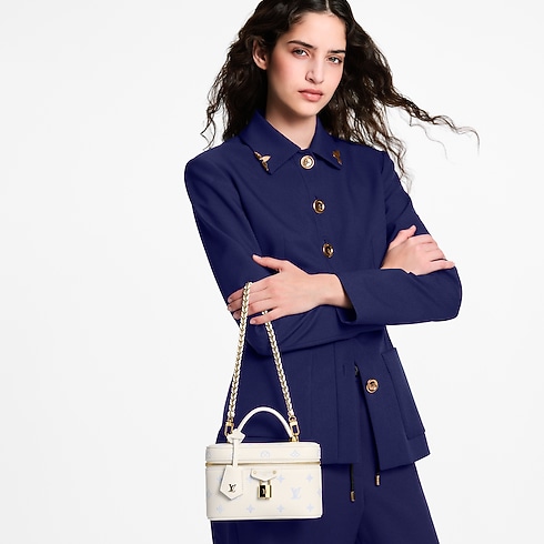 Modeled on archival Louis Vuitton cases, this Vanity Chain Pouch embodies the House’s spirit of travel. It is crafted from signature Monogram Empreinte leather in an elegant bi-color palette and features a signature LV-engraved padlock. The functional design includes a removable strap and chain, and is sized to fit essential items, such as a small coin purse and sunglasses.