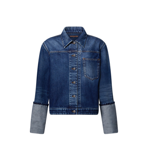 Playful proportions uplift this denim jacket with a contemporary spirit. Cut from classic raw blue denim, contrasting yellow topstitching highlights the construction, including a patch pocket on the chest. The sleeves are finished with exaggerated fold-over cuffs, while the waistband is signed with this season’s chic Louis Vuitton leather patch.
