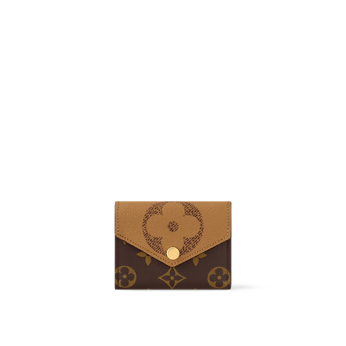 The Zoé wallet combines Monogram and Monogram Reverse Giant canvas for a chic, playful look. This tiny wallet is notable for its practical design, opening out to reveal a large flat pocket, a zipped coin pocket and several card slots. Its flap is secured with an engraved, gold-tone press-stud.