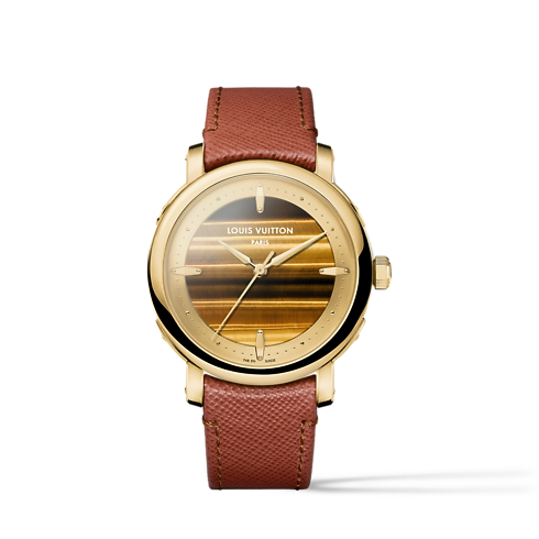 Marking the collection's first use of yellow gold, Louis Vuitton Escale Tiger's Eye debuts a new expression that lends greater depth to the stone. Carefully selected tiger's eye forms a continuous surface across the dial and middle case, its warm tonal striations calibrated to exude harmonious contrast and colour intensity.