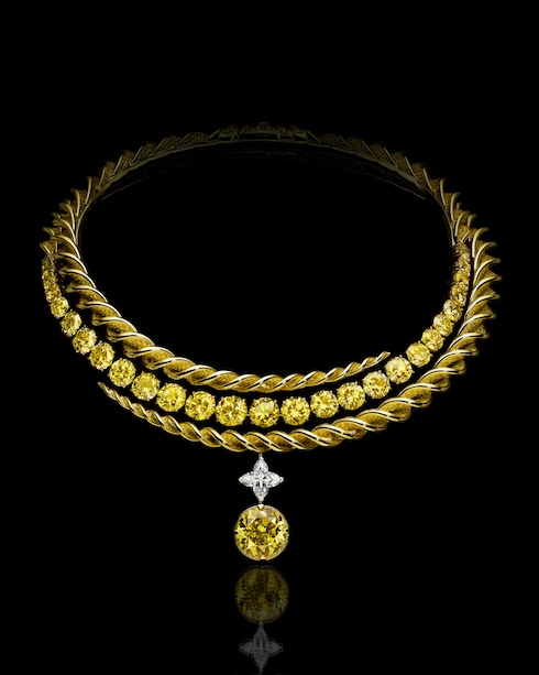 The radiant apex of brilliance, Eternal Sun is a pure, minimalist design — emancipated from all codes, where the creator expresses himself with unrestrained genius, the epilogue of the collection. A golden spiral twists around 27 exquisite yellow diamonds, centered by an exclusive 3.88-carat LV Monogram Star cut diamond and a magnificent 14-carat round yellow diamond, glowing with uninhibited elegance. It fuses mastery and freedom in an endlessly versatile form — a golden apotheosis of light.