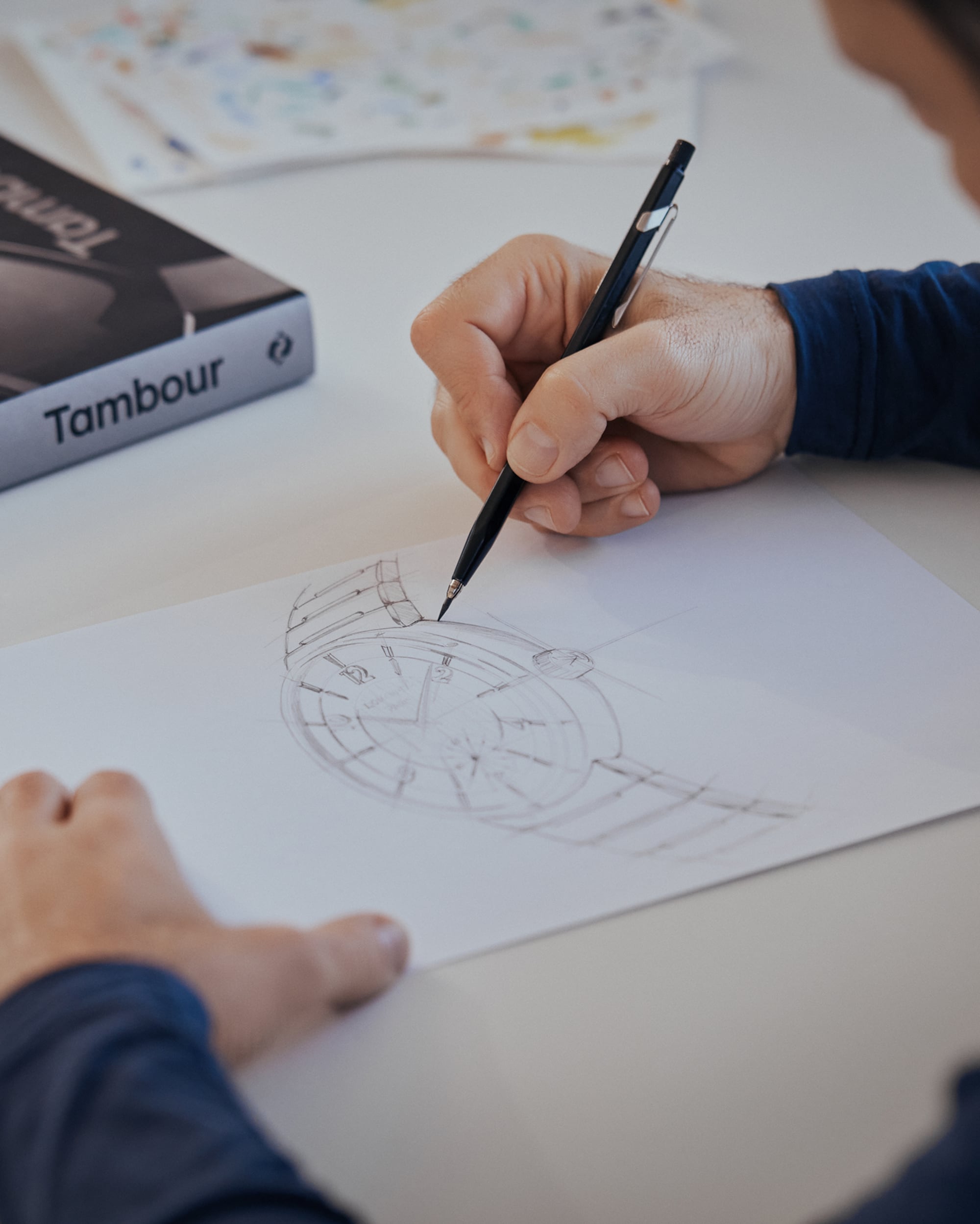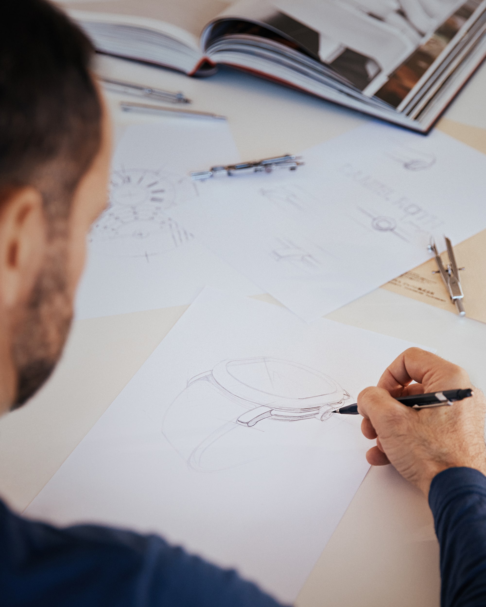 An idea begins with a pencil sketch, which is then brought to life through a more vivid depiction in gouache or watercolour. Each curve, shape, and nuance is then tirelessly refined, gradually revealing the silhouette of a new watch creation. At this moment, time takes on another dimension and gives way to 3D modeling — the beginning of a journey between tradition and modernity, artistic expression, and technical rigor, until the final piece is unveiled.