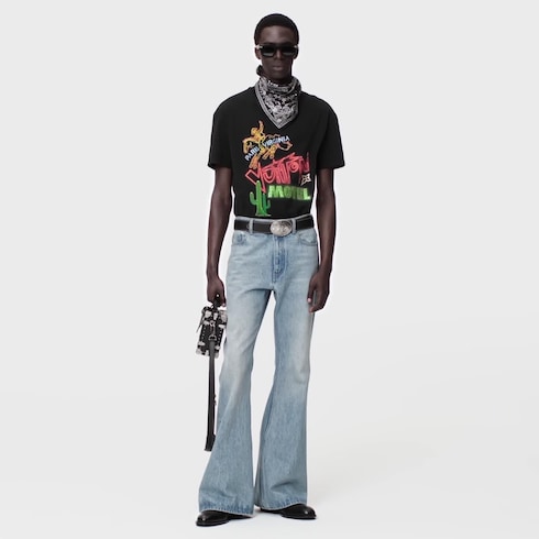 T-shirt berwarna hitam ini terbuat dari bahan katun ringan khas musim panas. Desainnya berhiaskan motif Vuitton Motel dari pergelaran koleksi Fall-Winter 2024. Sementara rangkaian kristal yang membentuk elemen signature menghasilkan tampilan menyerupai