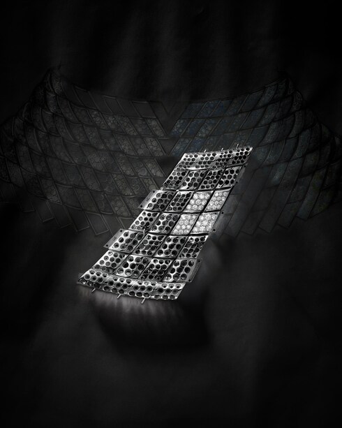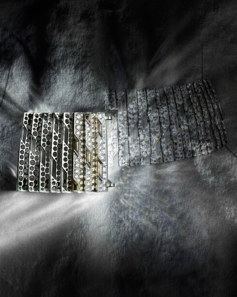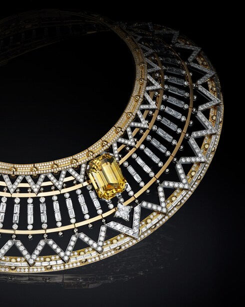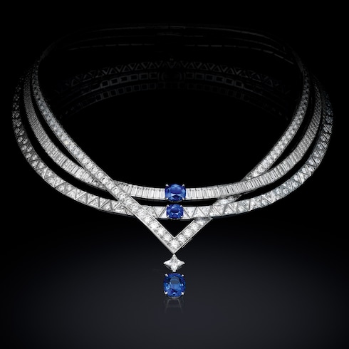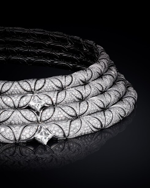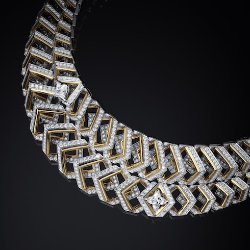 Dynamisme mengingatkan akan kolektivisme modern pada era itu, melahirkan fenomena bepergian yang menempatkan Louis Vuitton di area terdepan dalam inovasi. Sebuah kalung yang sangat struktural menciptakan tampilan grafis saling terhubung lewat link dan berlian LV Monogram Star cut, menggaungkan keterampilan teknikal dalam corak duo chevron 3D, sementara platinum dan yellow gold mempertegas arahan sikunya.