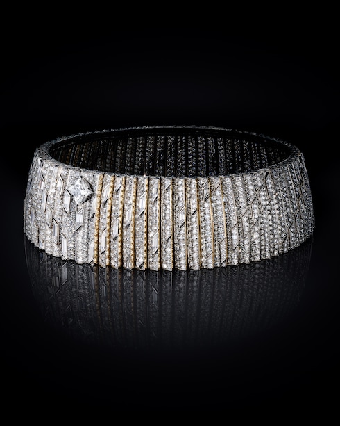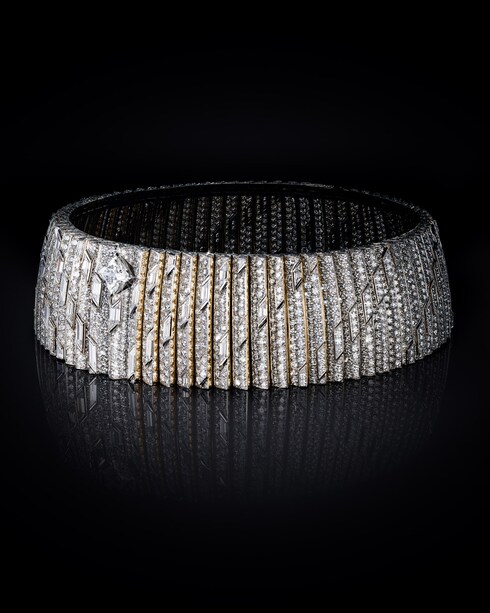 Pesona Paris dihadirkan dalam Optimisme, yang dirancang dalam sebuah permainan arsitektural yang anggun Sophisticated dan elegan, choker yang bold ini mengelilingi area leher dengan desain dual tone-nya yang disusun dari baguette diamonds di antara fasad platinum dan yellow gold yang saling bertautan — sebuah konfigurasi untuk refleksi optimal.