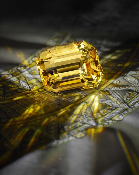 Link berbentuk V yang saling bertautan dirancang dari rivet nan mewah, mengingatkan akan karakter desain pembuatan trunk dari Rumah Mode — terwujud dalam perhiasan elegan, beraksentuasi batu safir berwarna kuning keemasan.