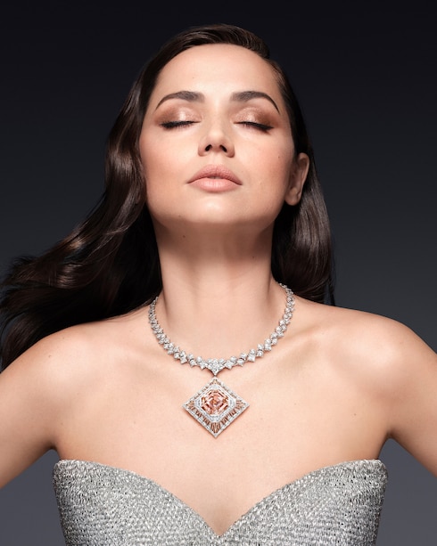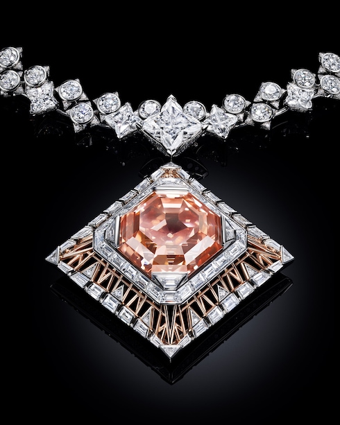 Menjadi pusat dari keindahan perhiasan ini, sebuah berlian 56,23 karat, menarik perhatian dengan rona warna pink dengan sentuhan warna oranye dan cokelat -- sebuah keindahan alam yang terelevasi lewat potongan dan fasetnya yang besar.